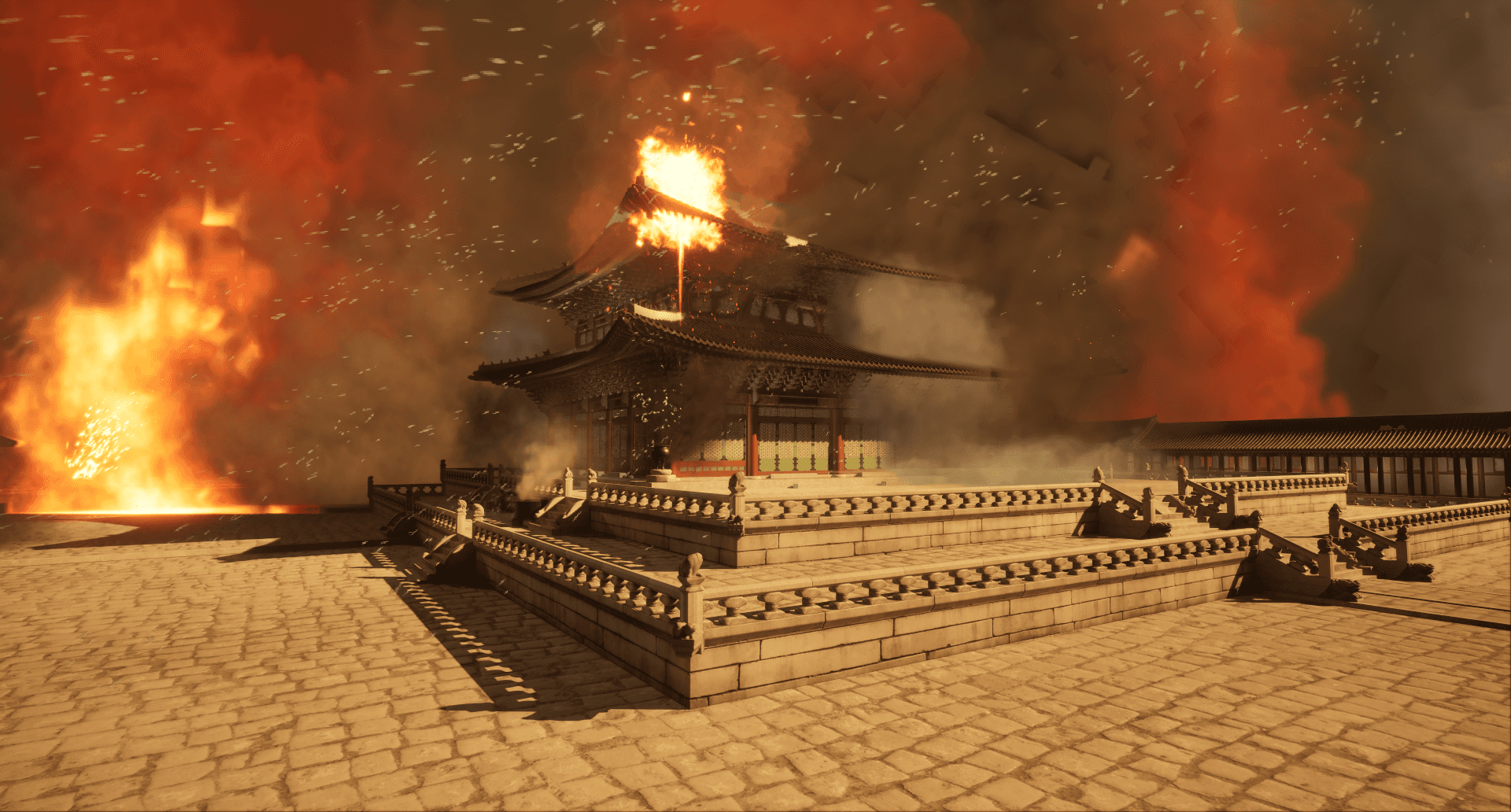 Once a serene and majestic Japanese palace, renowned for its breathtaking beauty and tranquil gardens, now lies in ruins. The once vibrant and harmonious grounds, where cherry blossoms danced in the breeze and koi swam in crystal-clear ponds, have been ravaged by relentless fires and violent storms. The intricate wooden structures, which once stood as symbols of grace and peace, are now charred remnants amid the scorched earth. The palace, which once echoed with the whispers of courtly life and the gentle strains of traditional music, now stands silent and desolate, a poignant reminder of its former splendor.